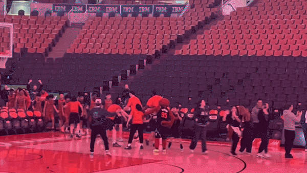 Anyhow, the team leaders led us to the first spectator row behind the scoring table and told us to sit there. It was supposed to be a boring intermission… but my teammate had brought his ball by accident and we weren’t supposed to bring it. The Raptor saw the ball and asked for it, and he got it. What he proceeded to do, I would never in a million years have guessed.
